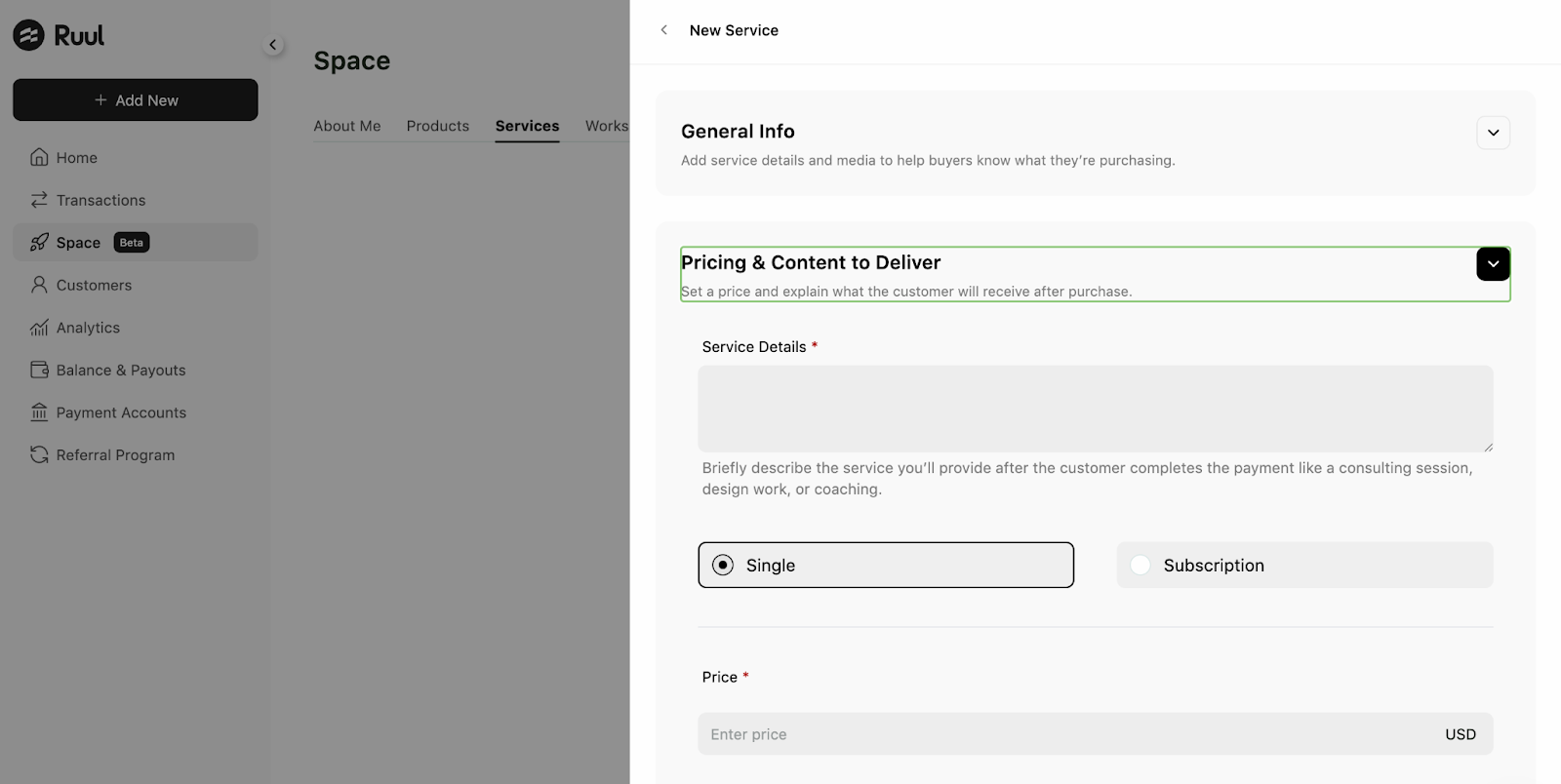 Ruul Space is a personal showcase and service sales platform where you can sell your online services and digital products as a freelancer. The combination of Ruul, which is already a "payment button" in its own right, with "Services" is a fantastic combo.