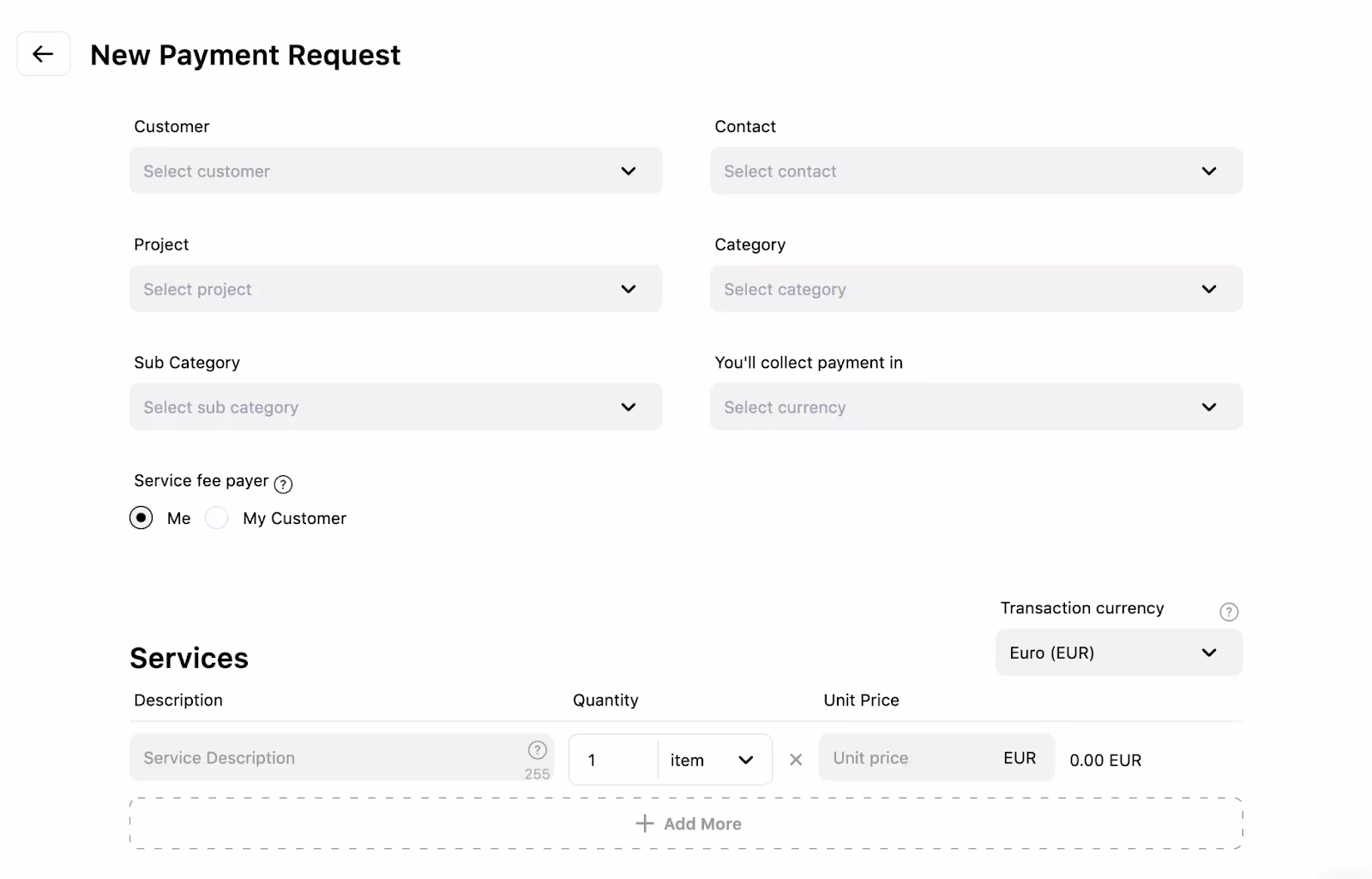 Additionally, for the collection of the service fee, you will see "Me" and "My Customer" options in the "Service fee payer" section. The decision here depends on your agreement with your client.
