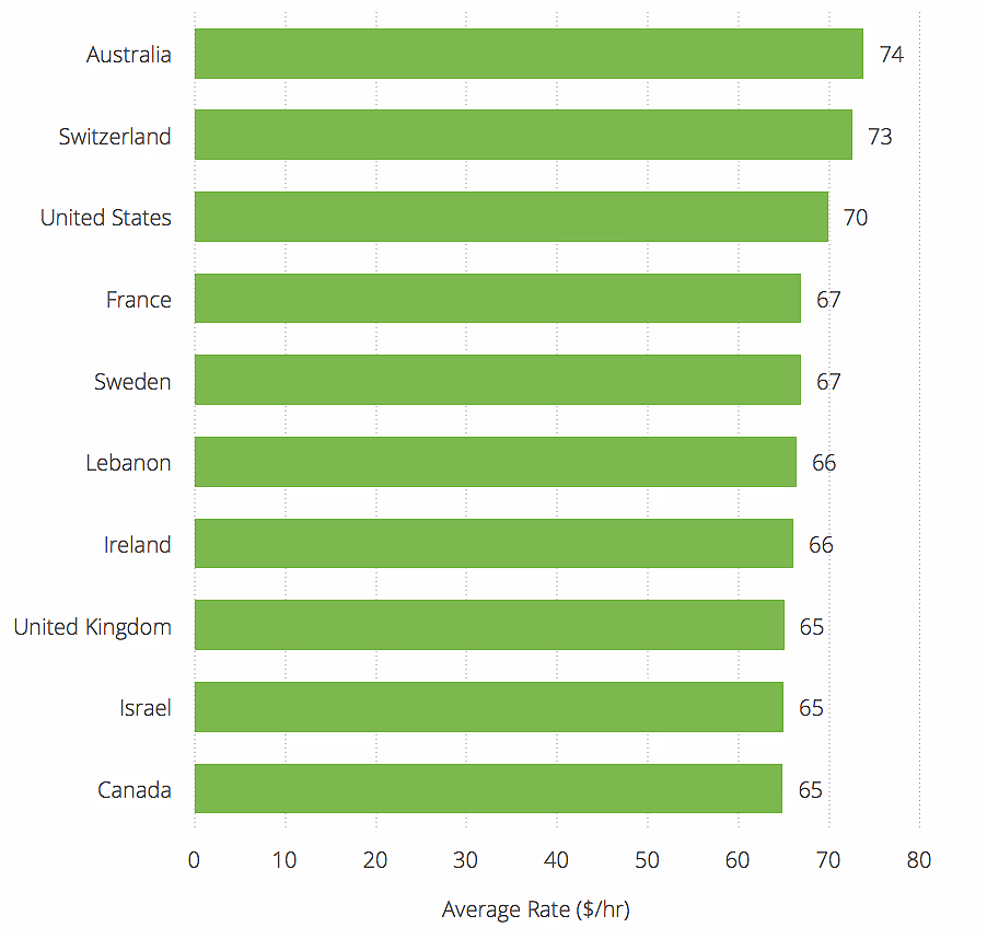 Other countries in the ranking, such as France, Sweden, Lebanon, Ireland, and the United Kingdom, pay $60-67 per hour. These are still solid wages, especially when compared to the global average.