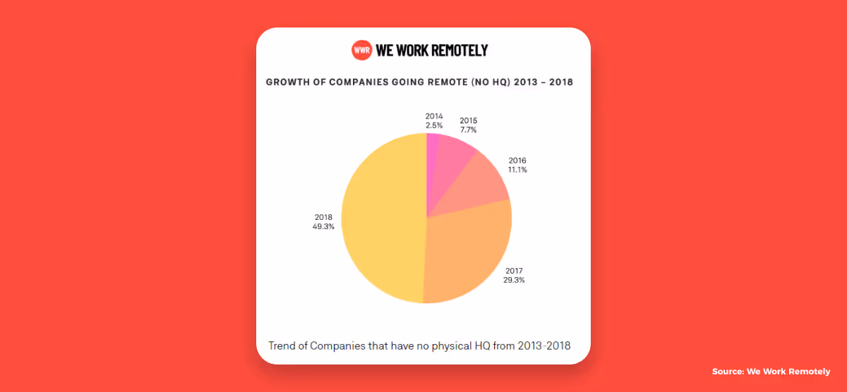It is hard to make a distinction. While until recently, telecommuting was seen as identical to remote work and two concepts were used almost interchangeably, it is easy to realize that the term “telecommuting” is not as trendy as it used to be.Telecommuting suggests that the work may be done at the headquarters in some part. Therefore, it can at times be identified as an occasional version of remote work. Another feature of telecommuting is the fact that there is a base or a site for work, whereas the communication for the work can be carried out through internet-related media.Remote work on the other hand does not require a physical headquarter. Generally you either work for yourself or a remote company (like us at Ruul). You can be based anywhere in the world, whereas if you are a telecommuter, it is highly likely that you are based in the same geographical area with occasional visits to your workplace for purposes such as meetings, taxation, and etc.Data from We Work Remotely, the largest remote work community in the world shows that growth of companies without physical headquarters has risen from 2.5% (2014) to 49.3% (2018), therefore, it would not be improper to derive from these statistics that the numbers of remote workers have been on a significant rise in the last decade.