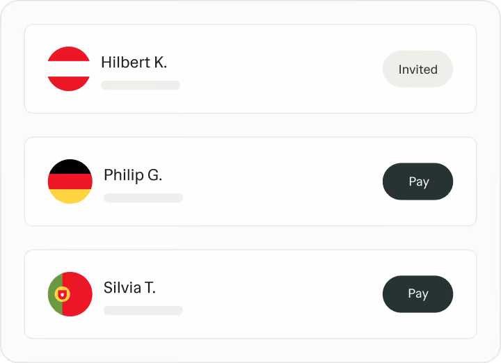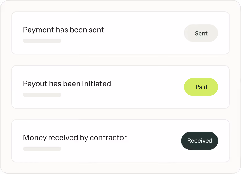 Upload a payout batch once, review the details, and send payments in one run. Each contractor payout is processed individually, and you can track the status of every payout from sent to received.