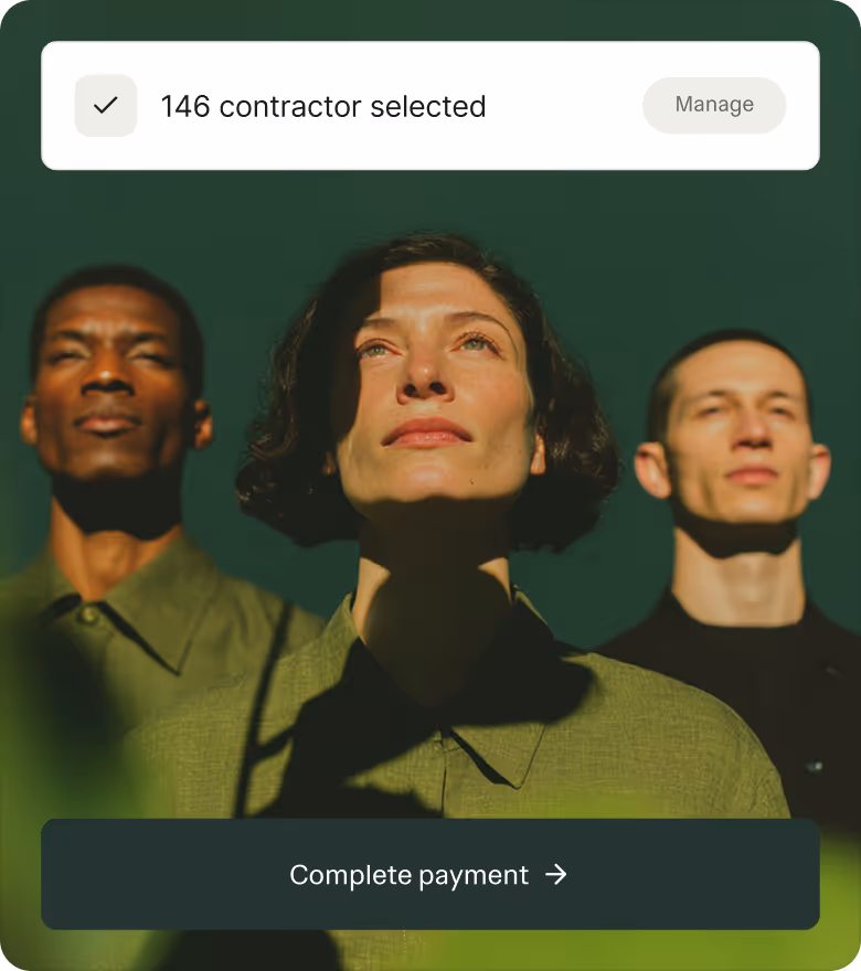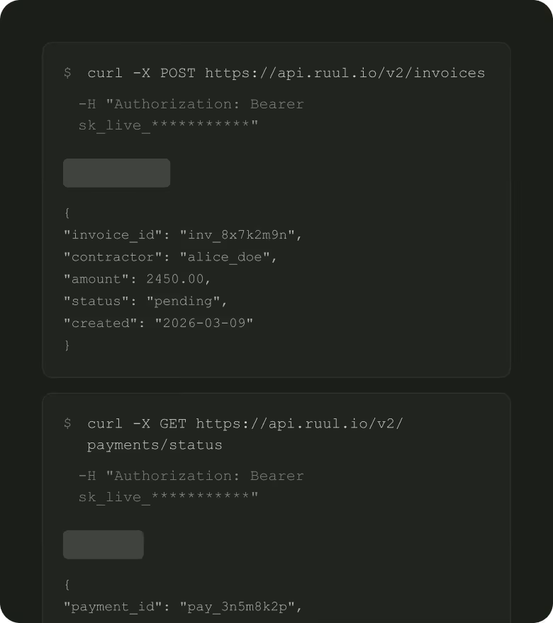 You onboard contractors with built-in checks, contracts, and tax forms. Then you select and pay one or multiple contractors using your preferred payment method. Ruul acts as the legal counterparty, provides a business-ready invoice you can process easily, and the contractor receives their payout within 1 business day.